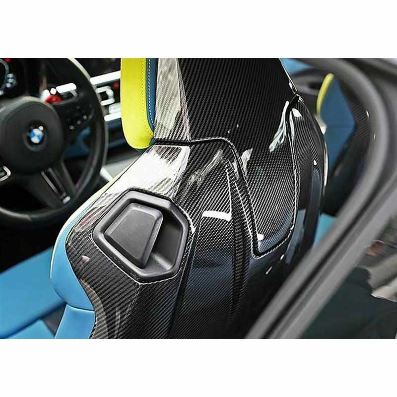 M3、M4の純正シートにそのまま取り付けできる、上下2分割のフルカーボンのシートバックパーツ。
