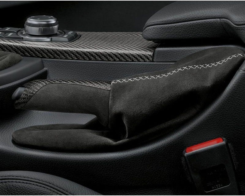 カーボンとアルカンターラのコンビネーション仕上げのハンドルにアルカンターラのブーツ付きサイドブレーキ。シルバーグレーのクロスステッチのワンポイントと共に"M Performance"であることを彷彿させます。
