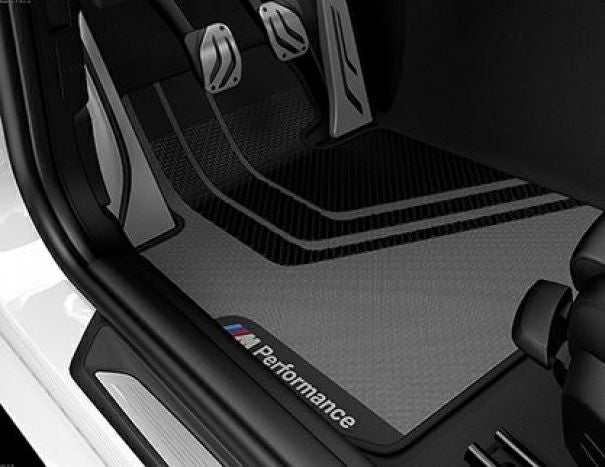 "///M Performance"ロゴ入りのフロアマットはラバーと繊維素材の混合で濡れや汚れにも強く、フロアマットを守ります。
