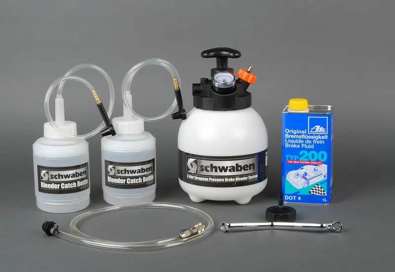 Schwaben(シュヴァーベン)製のブレーキフルード ブリーダー/キャッチボトル/ブリーダー レンチに、Ate製のブレーキフルードがセットになった交換キットです。 パフォーマンスベースの用途向けに、DOT4ブレーキフルードを使用しての適切なブレーキフルードの交換を行うために必要なものが含まれています。 ブリーダータンクのトップには確認しやすい圧力計が組み込まれ、充填キャップには圧力を安全に逃がすための弁が付いています。 取り外し可能なスイベルフィッティングを備えた長さ40インチのホースで、古いオイルの抜き取り・新しいオイルへの入れ換え・エア抜きが簡単スピーディに可能。 キット内容: ・Schwaben製 ヨーロピアン プレッシャーブリーダー(容量3L) ・Schwaben製 キャッチボトル(容量1L)×2 ・Schwaben製 11mmブリーダー レンチ ・Ate製 TYP200 DOT4ブレーキフルード(1L) ※古いブレーキフルードをすべて交換するのには、通常1リットルのフルードしか必要としません ※ブレーキフルードは吸湿性が高いため、開缶後は使い切る/廃棄することをお勧めします