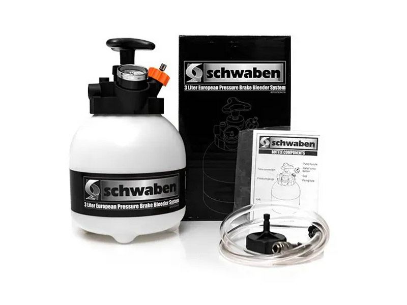 Schwaben(シュヴァーベン)製 容量3リットルのブレーキフルード ブリーダーです。 タンクのトップには確認しやすい圧力計が組み込まれ、充填キャップには圧力を安全に逃がすための弁が付いています。 取り外し可能なスイベルフィッティングを備えた長さ40インチのホースで、古いオイルの抜き取り・新しいオイルへの入れ換え・エア抜きが簡単スピーディに可能。
