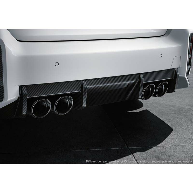 BMW純正のM Performance リアカーボンディフューザーです。 BMW G87型のM2に適合します。 純正マフラー用。 G87のボクシーなエクステリアを強調する専用リアディフューザーです。 カーボンファイバー製で、軽量かつ最適な形状に成形されており、ハイパフォーマンスモデル向けのパーツとして相応しい外観を備えています。