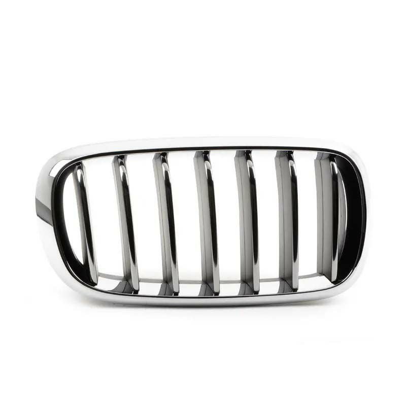 BMW純正のクローム・フロントグリル(右)です。 BMW F15型X5に適合します。 フロント右側用。 全体がクロームメッキされたエレガントなフロントキドニーグリル。 ハウジング部、スラット部共にクロームメッキされているタイプです。。 フロントグリルは車体正面にあるため、飛び石等の影響を受けやすいパーツです。 メッキが剥がれたり、各部に傷がついてしまったグリルは交換がおススメです。