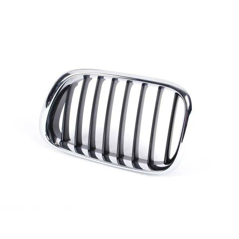 BMW純正のクローム/ブラック・フロントグリル(左)です。 BMW E53型X5の前期モデルに適合します。 フロント左側用。 ハウジング部がメッキ、スラット部はブラックと色分けされたクールなフロント・キドニーグリル。 フロントグリルは車体正面にあるため、飛び石等の影響を受けやすいパーツです。 メッキが剥がれたり、各部に傷がついてしまったグリルは交換がおススメです。
